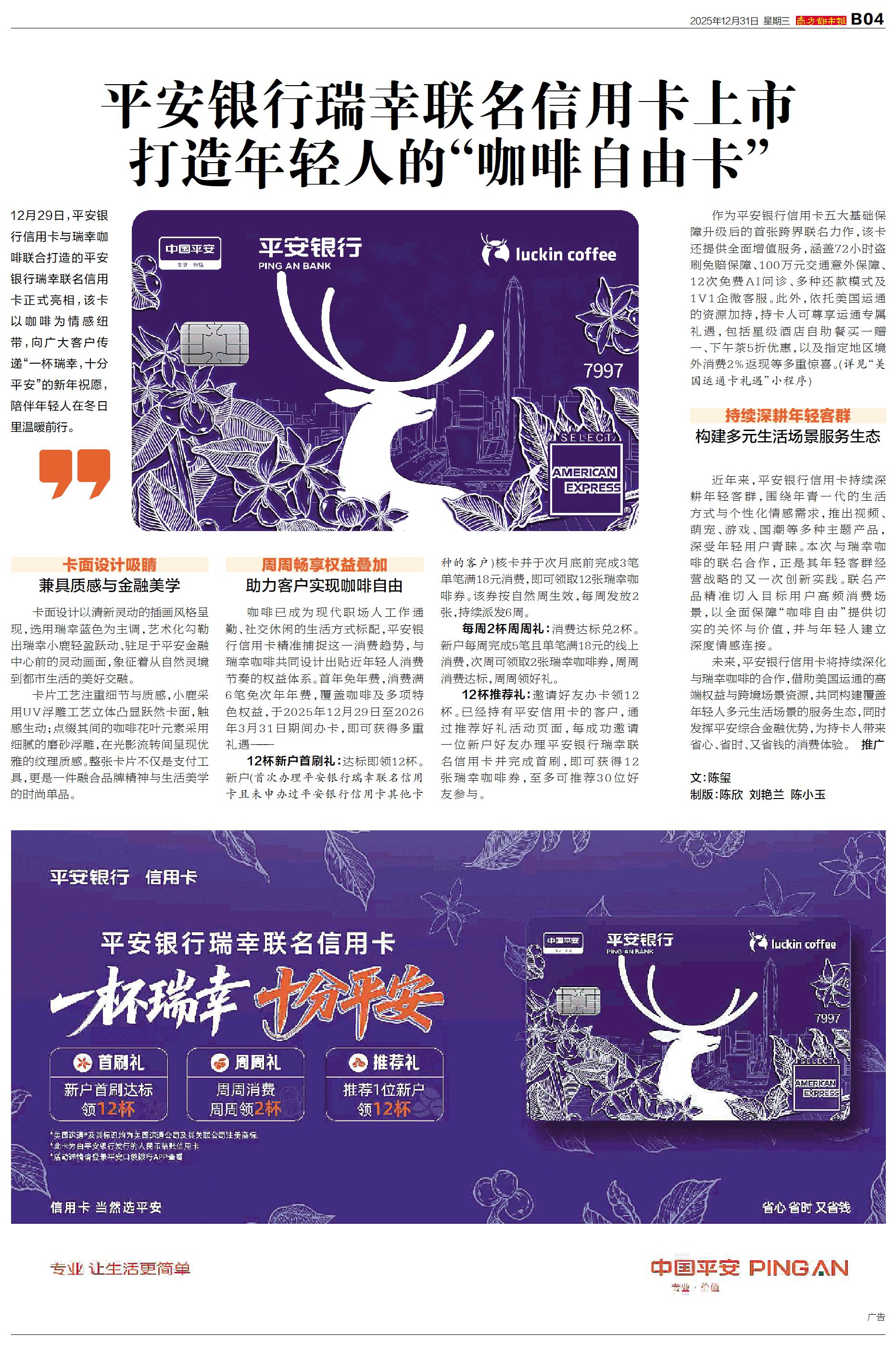 12月29日,平安银行信用卡与瑞幸咖啡联合打造的平安银行瑞幸联名信用卡正式亮相,该卡以咖啡为情感纽带,向广大客户传递“一杯瑞幸,十分平安”的新年祝愿,陪伴年轻人在冬日里温暖前行。