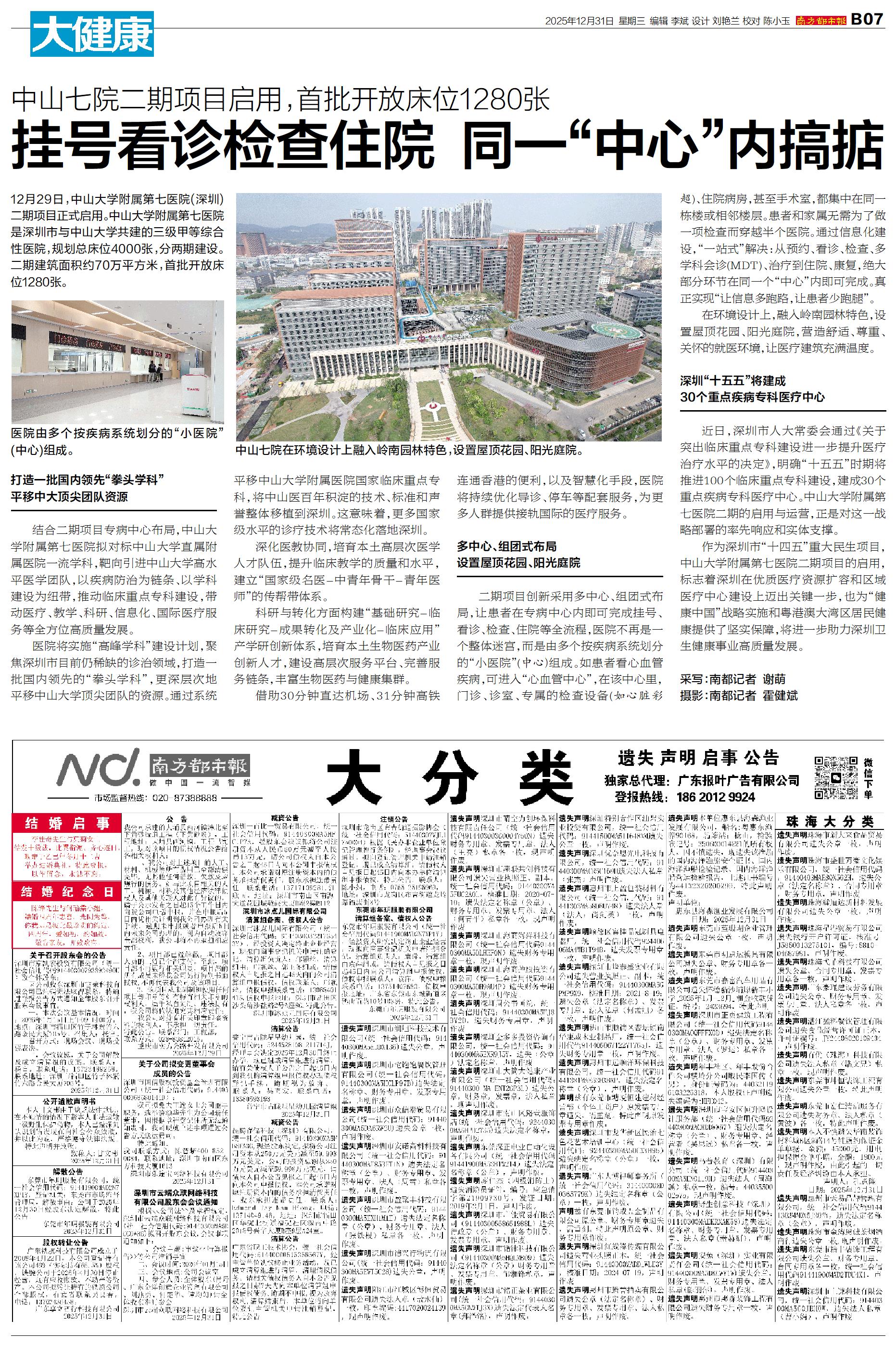 12月29日,中山大学附属第七医院(深圳)二期项目正式启用。中山大学附属第七医院是深圳市与中山大学共建的三级甲等综合性医院,规划总床位4000张,分两期建设。二期建筑面积约70万平方米,首批开放床