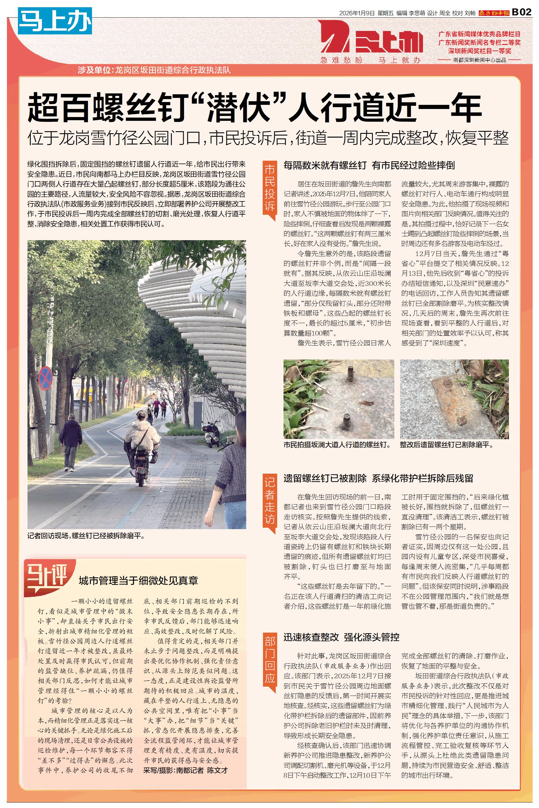 市民拍摄坂澜大道人行道的螺丝钉。 整改后遗留螺丝钉已割除磨平。 记者回访现场,螺丝钉已经被拆