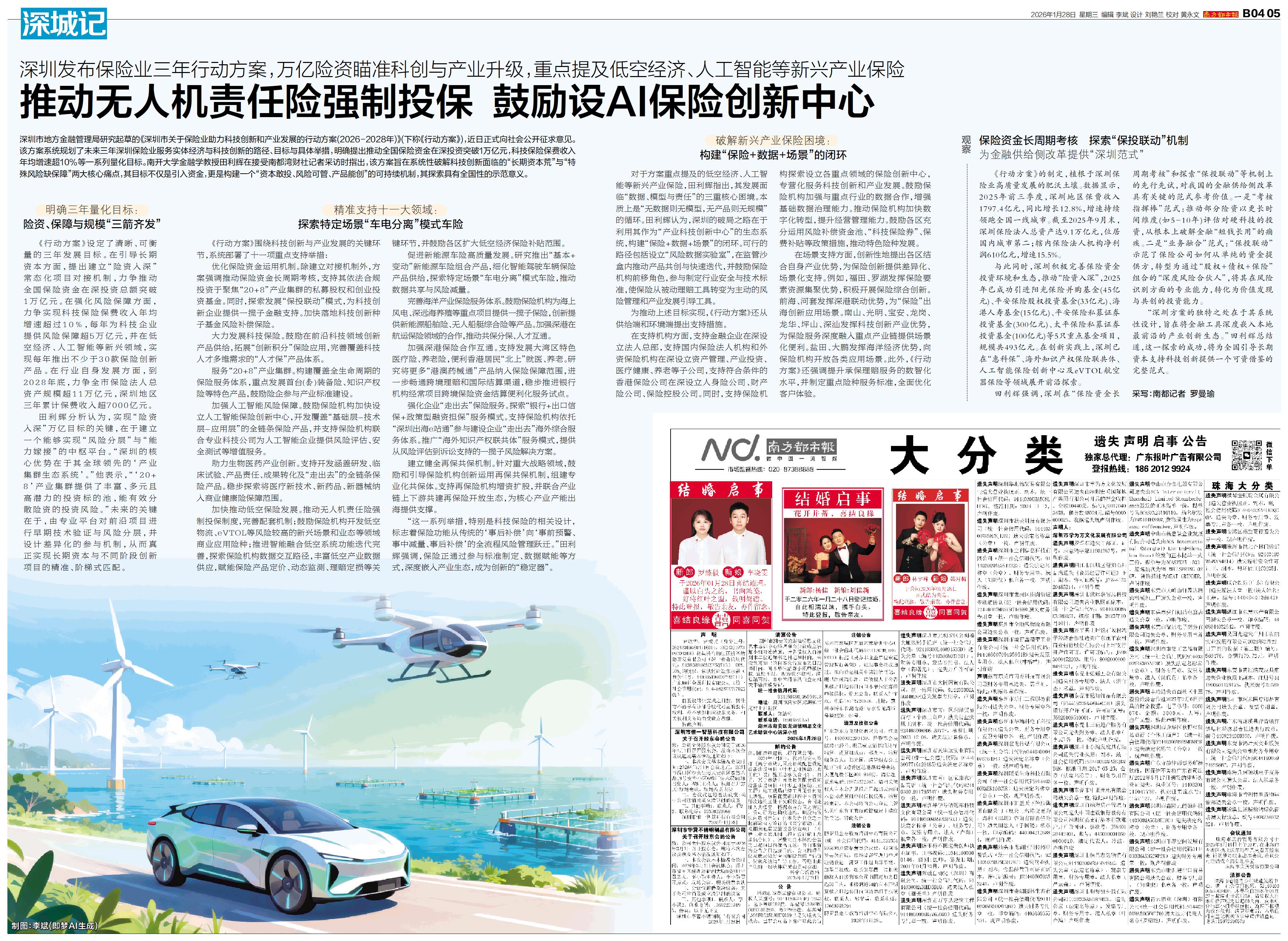 深圳市地方金融管理局研究起草的《深圳市关于保险业助力科技创新和产业发展的行动方案(2026-2028年)》(下称《行动方案》),近日正式向社会公开征求意见。该方案系统规划了未来三年深圳保险业服务实
