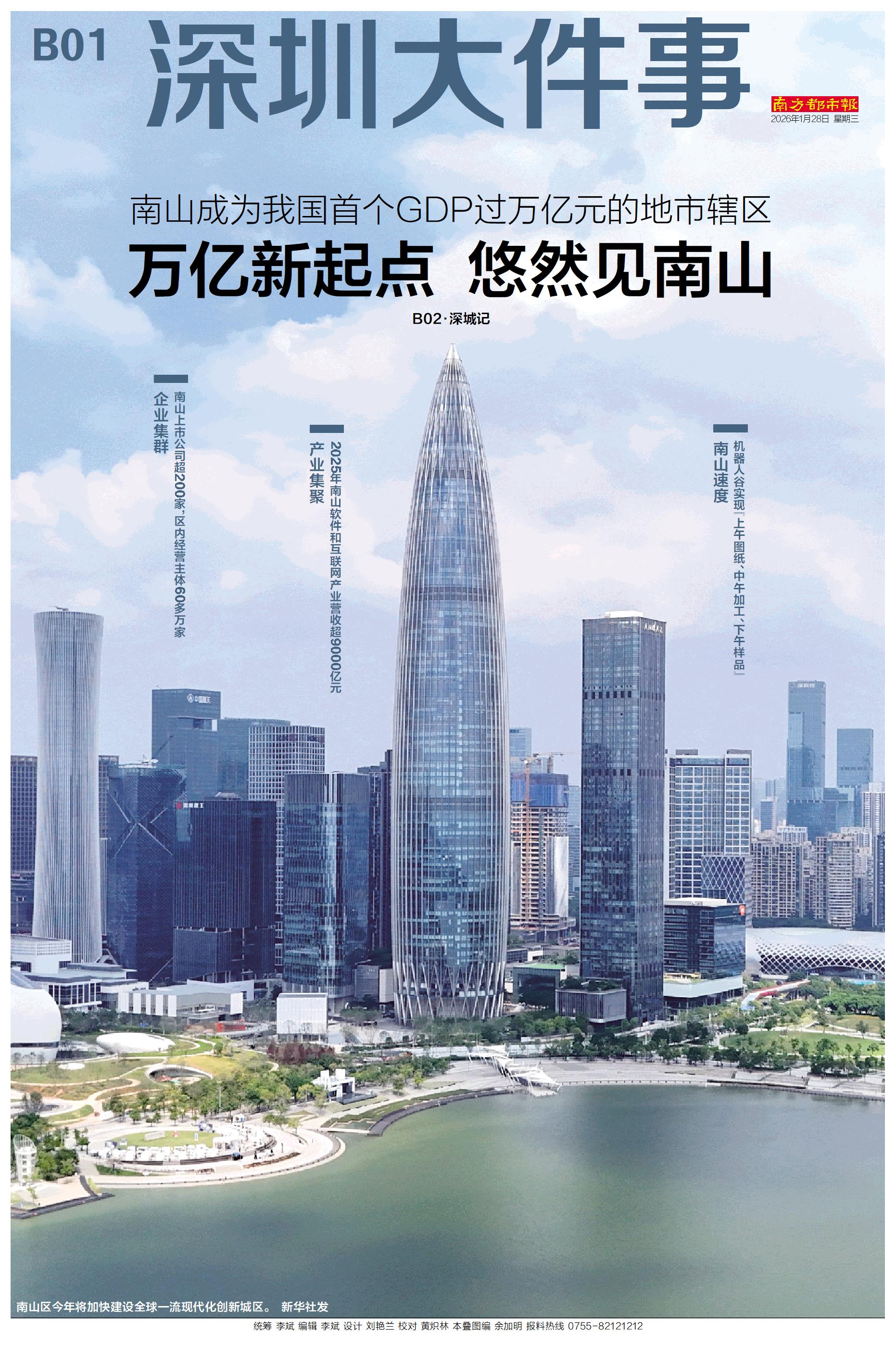 企业集群 南山上市公司超200家,区内经营主体60多万家 产业集聚 2025年南山软件和互联网产业营收超9000亿元 南山速度 机器人谷实现“上午图纸、中午加工、下午样品” B02·深城记