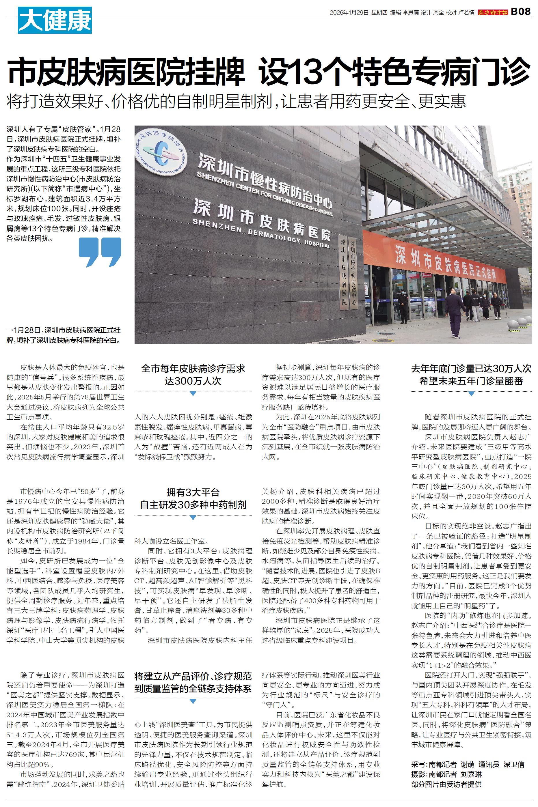 深圳人有了专属“皮肤管家”。1月28日,深圳市皮肤病医院正式挂牌,填补了深圳皮肤病专科医院的空白。 作为深圳市“十四五”卫生健康事业发展的重点工程,这所三级专科医院依托深圳市慢性病防治中心(市皮