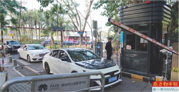 深圳湾公园试点取消预约停车,车辆排队进入停车场。
