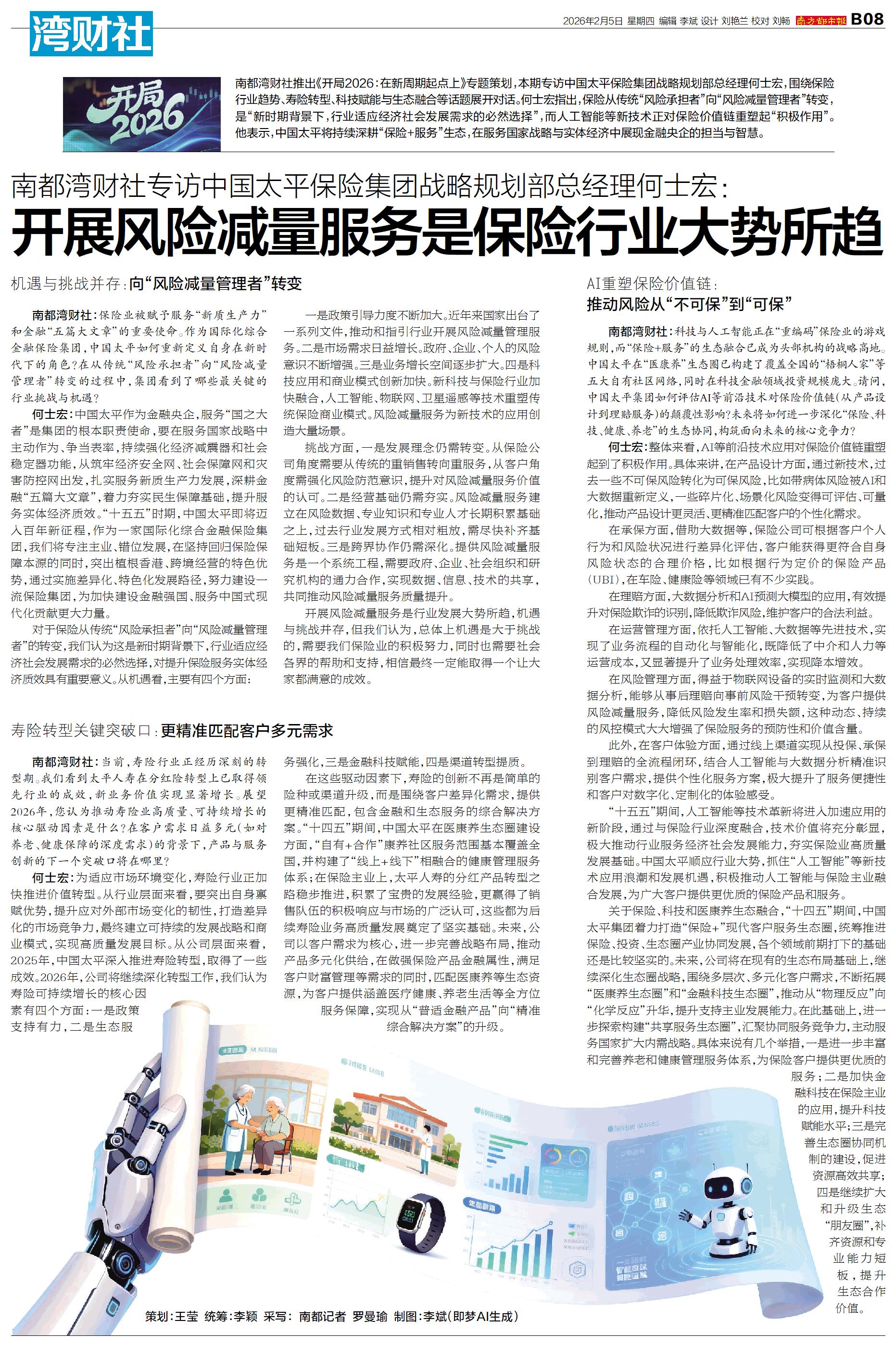 南都湾财社推出《开局2026:在新周期起点上》专题策划,本期专访中国太平保险集团战略规划部总经理何士宏,围绕保险行业趋势、寿险转型、科技赋能与生态融合等话题展开对话。何士宏指出,保险从传统“风险承