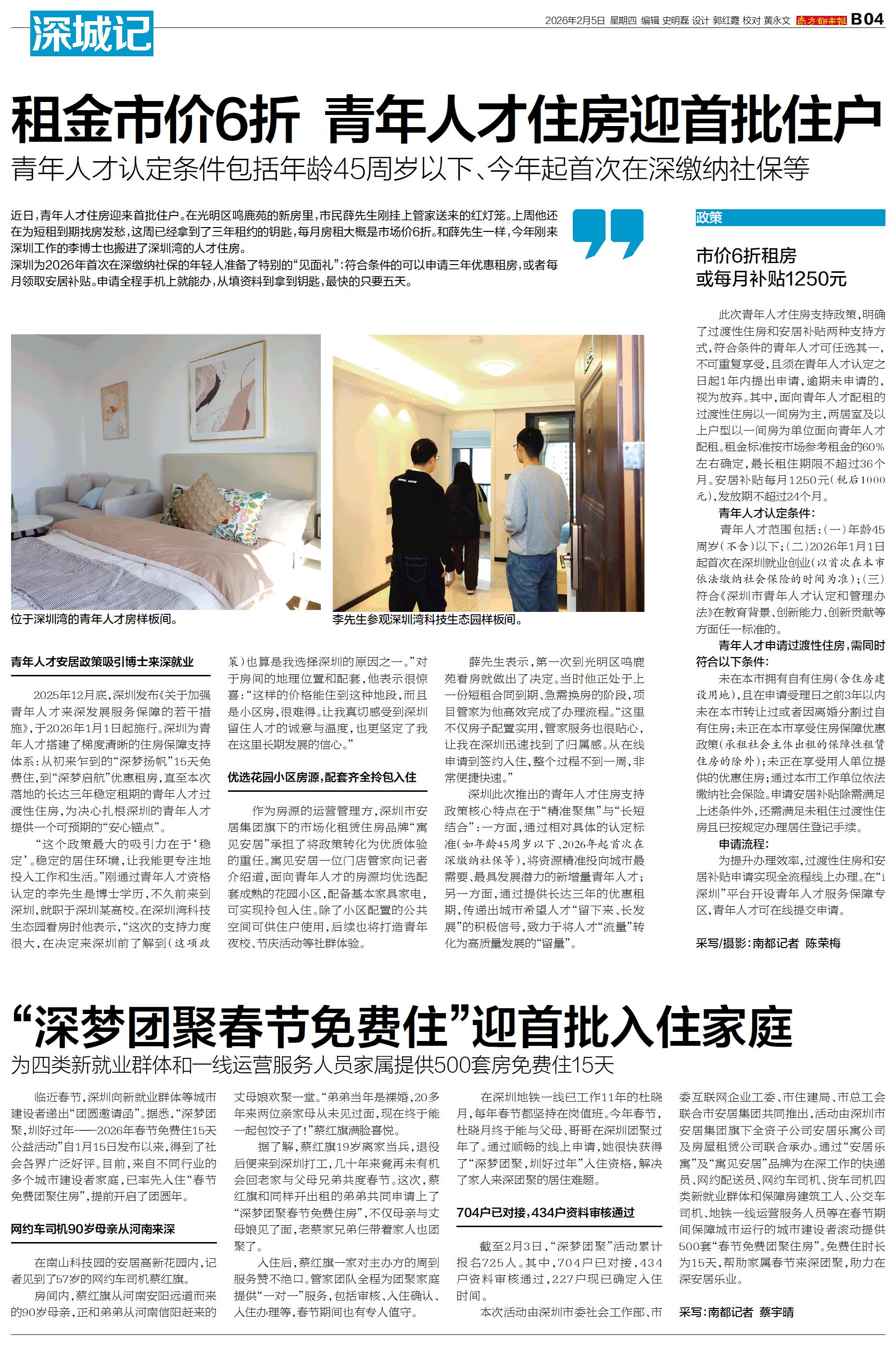 临近春节,深圳向新就业群体等城市建设者递出“团圆邀请函”。据悉,“深梦团聚,圳好过年——2026年春节免费住15天公益活动”自1月15日发布以来,得到了社会各界广泛好评。目前,来自不同行业的多个城