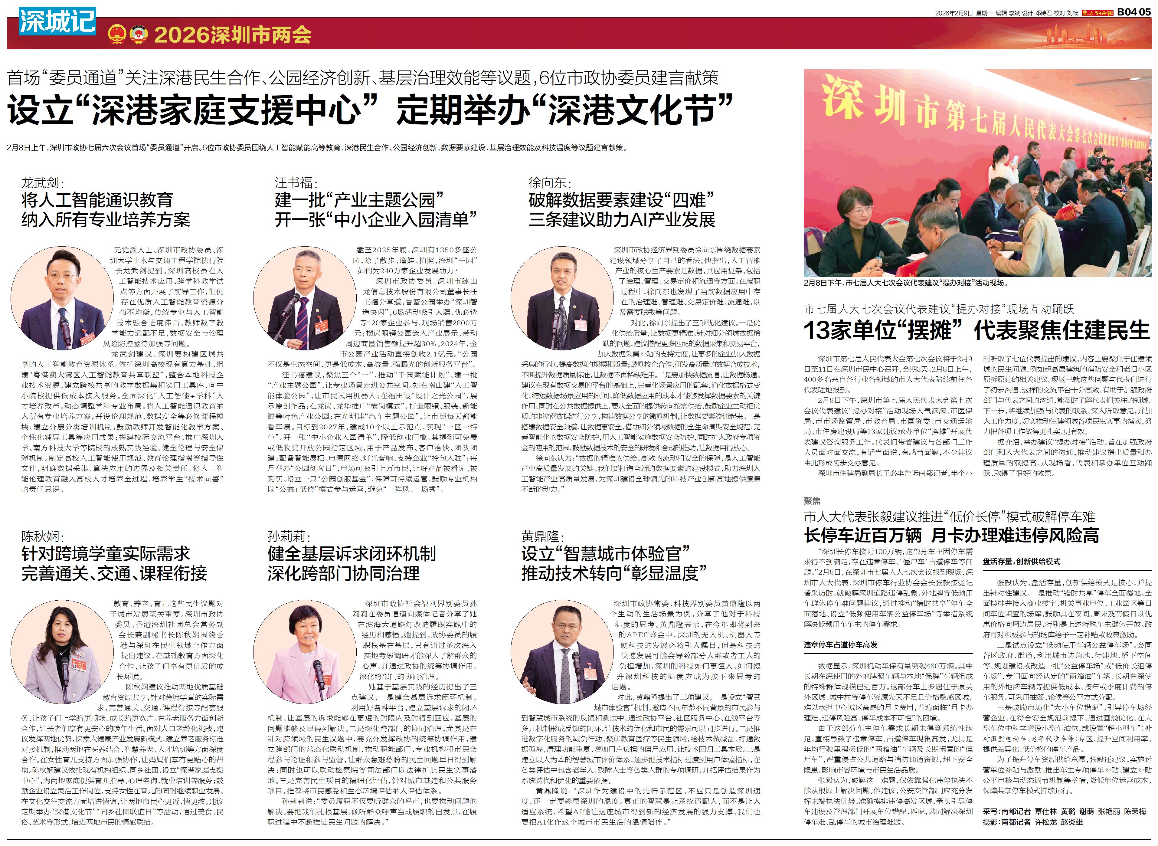 2月8日上午,深圳市政协七届六次会议首场“委员通道”开启。6位市政协委员围绕人工智能赋能高等教育、深港民生合作、公园经济创新、数据要素建设、基层治理效能及科技温度等议题建言献策。