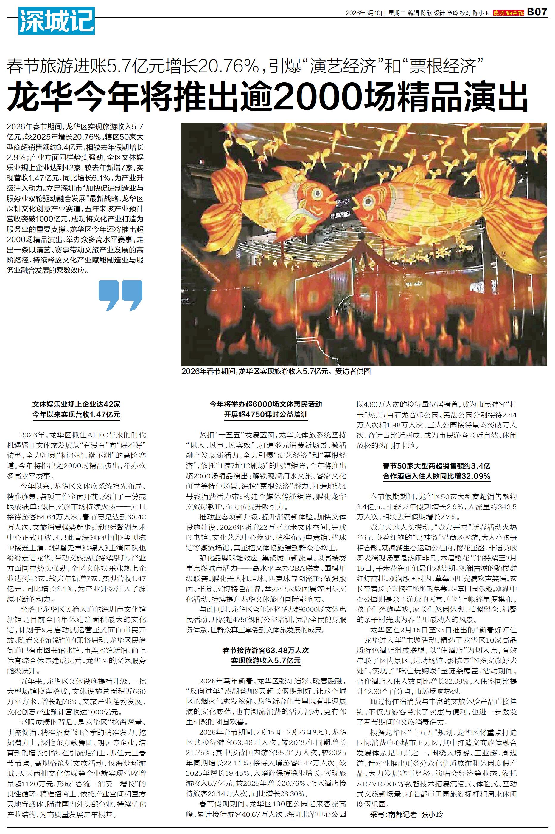 2026年春节期间,龙华区实现旅游收入5.7亿元,较2025年增长20.76%。辖区50家大型商超销售额约3.4亿元,相较去年假期增长2.9%;产业方面同样势头强劲,全区文体娱乐业规上企业达到42家,较去年新增7家,实现营收1.47亿元,同比增长6.1%,为产业升级注入动力。立足深圳市“加快促进制造业与服务业双轮驱动融合发展”最新战略,龙华区深耕文化创意产业赛道,五年来该产业预计营收突破1000亿元,成功将文化产业打造为服务业的重要支撑。龙华区今年还将推出超2000场精品演出、举办众多高水平赛事,走出一条以演艺、赛事带动文旅产业发展的高阶路径,持续释放文化产业赋能制造业与服务业融合发展的乘数效应。