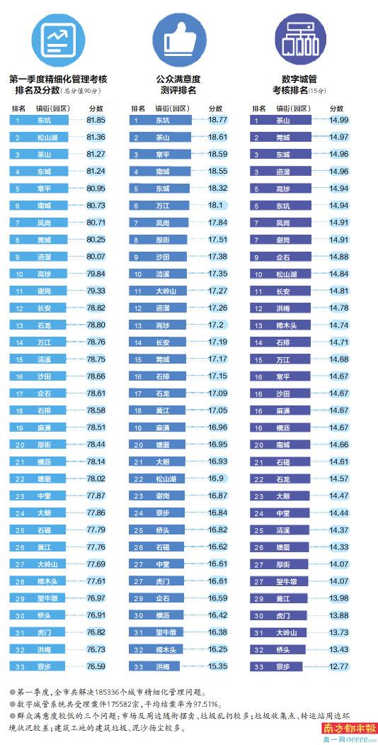 一座城市的城市精细化管理水平,不仅关系着城市竞争力,更与市民群众的幸福感和获得感息息相关。南都记者从东莞市城市管理和综合执法局获悉,在今年第一季度城市精细化管理考核中,东坑排名第一,其次是松山湖和茶山;寮步排名倒数第一,其次是洪梅和虎门。据统计,本季度全市共集中解决了18.5万余个城市精细化管理问题。