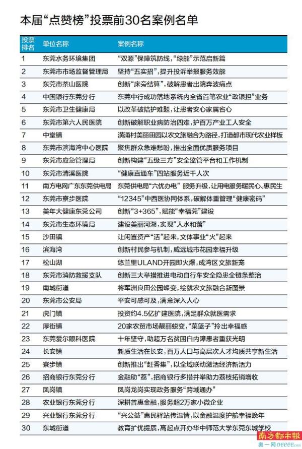 需要指出的是,经过为期一周激烈的点赞投票,第七届南都“东莞市民点赞榜”投票环节圆满落下帷幕,总投票数达到107万票,反响热烈。按照活动方案,此次投票环节票数列前30名的案例晋级评审环节。活动评审环节将邀请市人大代表、政协委员及相关领域专家,召开优秀案例专家评审会,点评、解读典型案例并打分。根据深调研、专家评审团打分、结合网络票数,评出各类优秀案例,形成第七届南都东莞市民点赞榜智库报告。