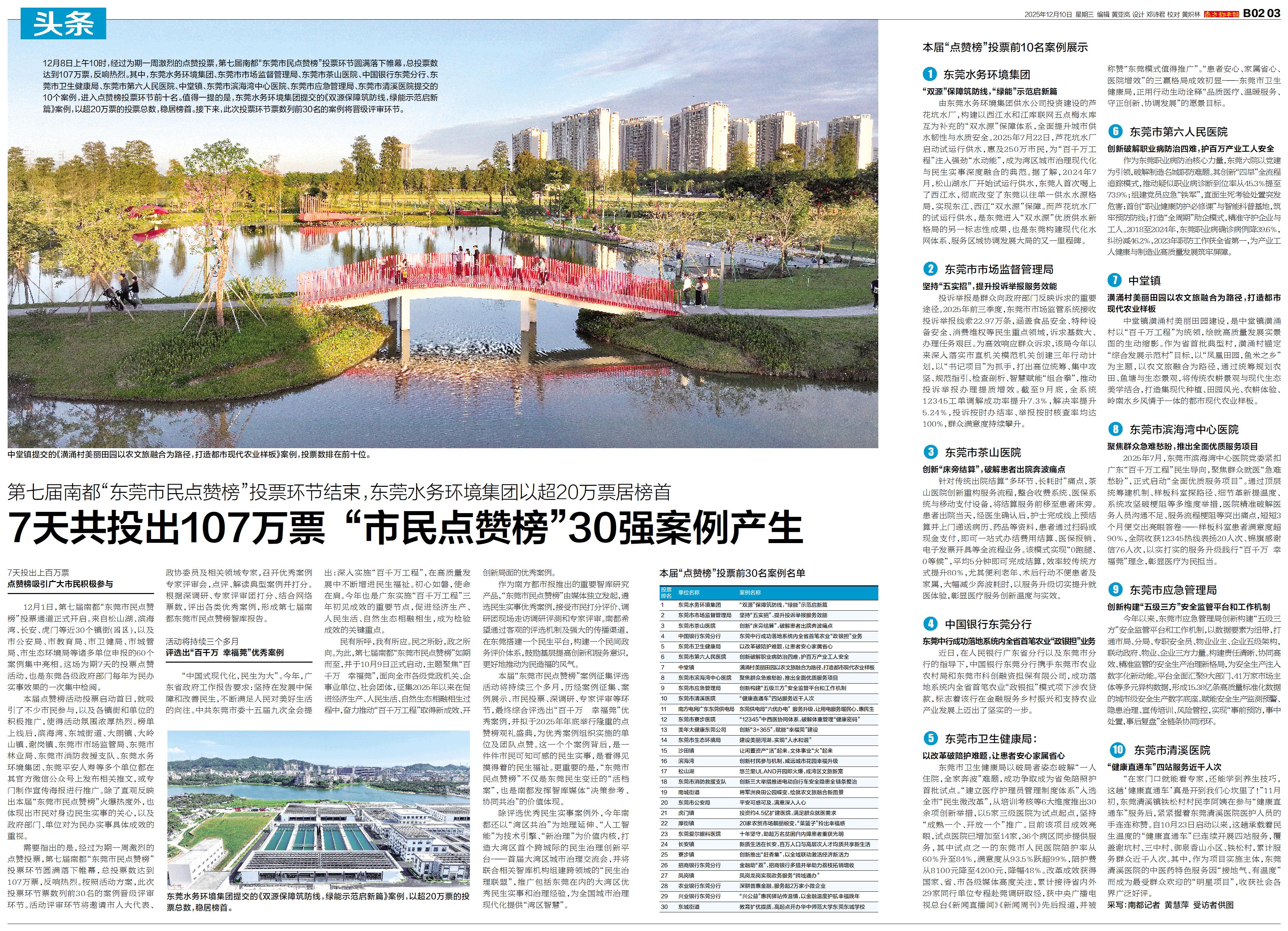 12月8日上午10时,经过为期一周激烈的点赞投票,第七届南都“东莞市民点赞榜”投票环节圆满落下帷幕,总投票数达到107万票,反响热烈。其中,东莞水务环境集团、东莞市市场监督管理局、东莞市茶山医院、