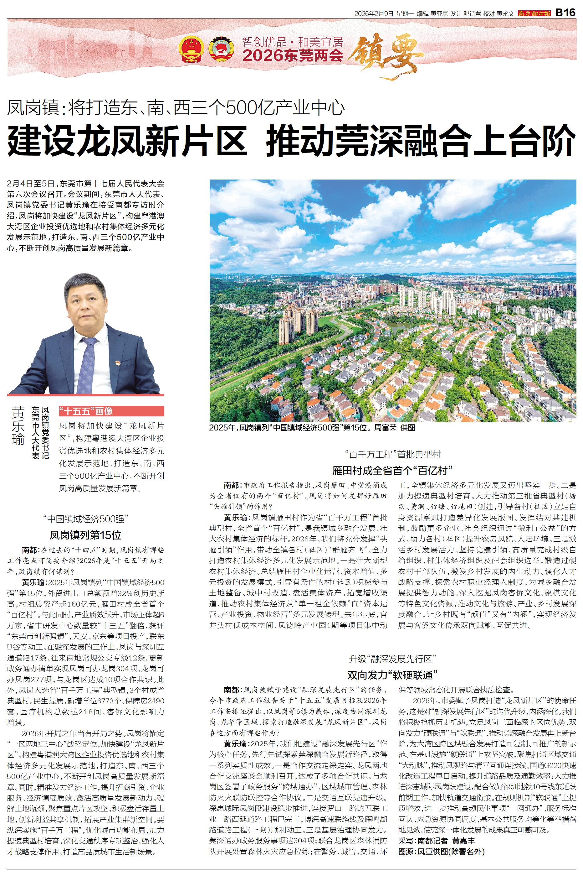 “十五五”画像 凤岗将加快建设“龙凤新片区”,构建粤港澳大湾区企业投资优选地和农村集体经济多元化发展示范地,打造东、南、西三个500亿产业中心,不断开创凤岗高质量发展新篇章。 2月4日至5日,