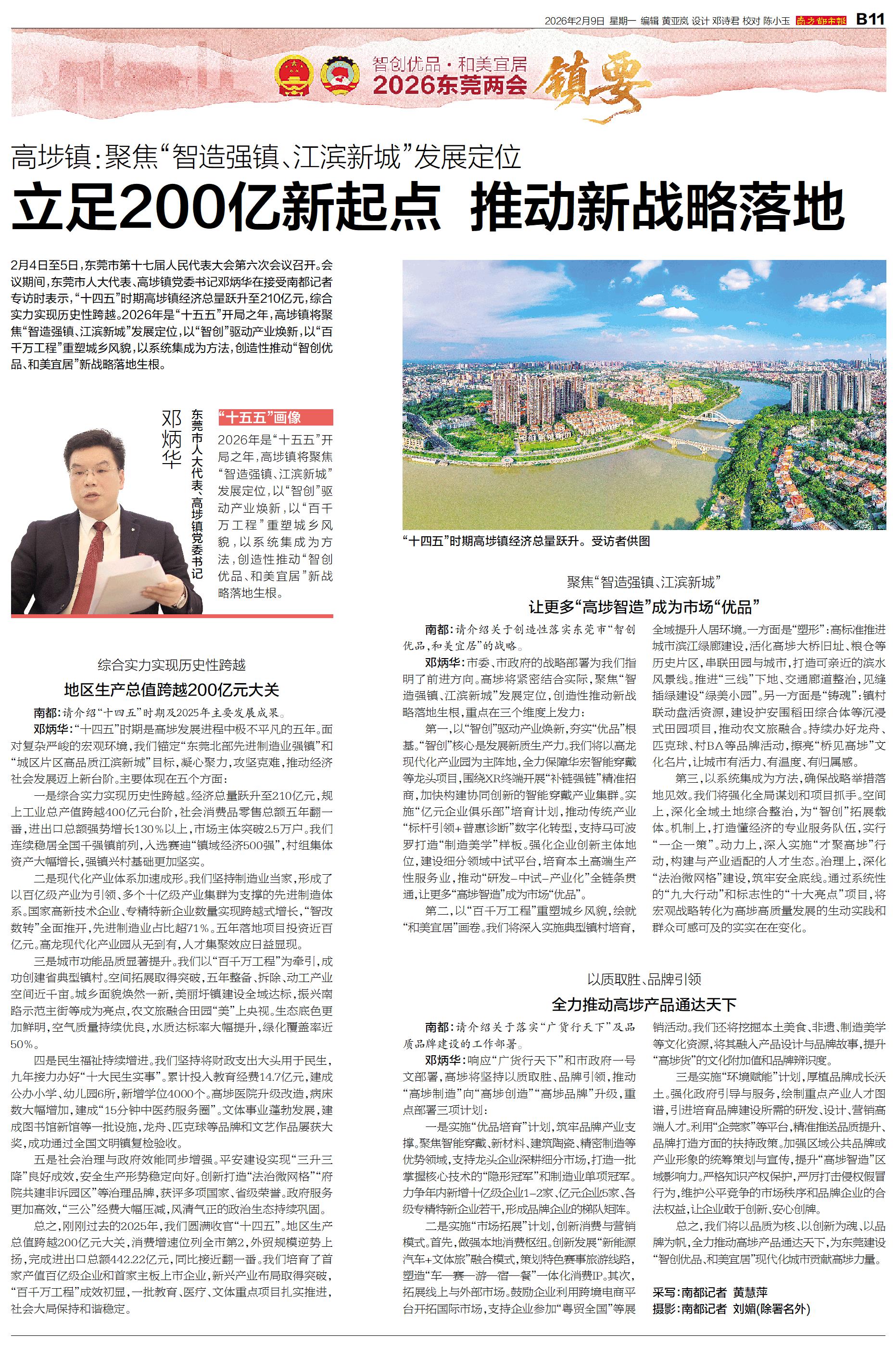 “十五五”画像 2026年是“十五五”开局之年,高埗镇将聚焦“智造强镇、江滨新城”发展定位,以“智创”驱动产业焕新,以“百千万工程”重塑城乡风貌,以系统集成为方法,创造性推动“智创优品、和美宜居