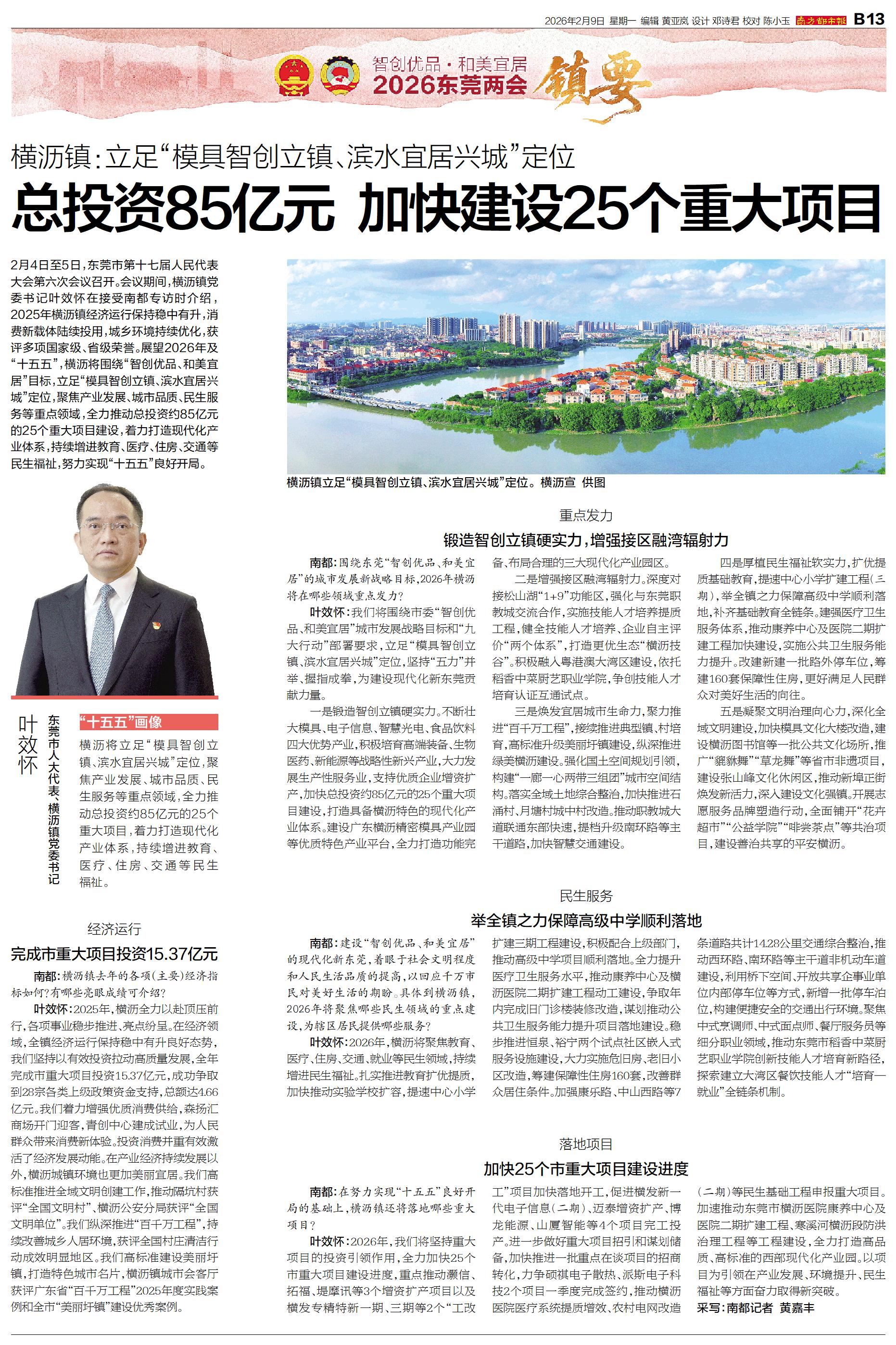 “十五五”画像 横沥将立足“模具智创立镇、滨水宜居兴城”定位,聚焦产业发展、城市品质、民生服务等重点领域,全力推动总投资约85亿元的25个重大项目,着力打造现代化产业体系,持续增进教育、医疗、住