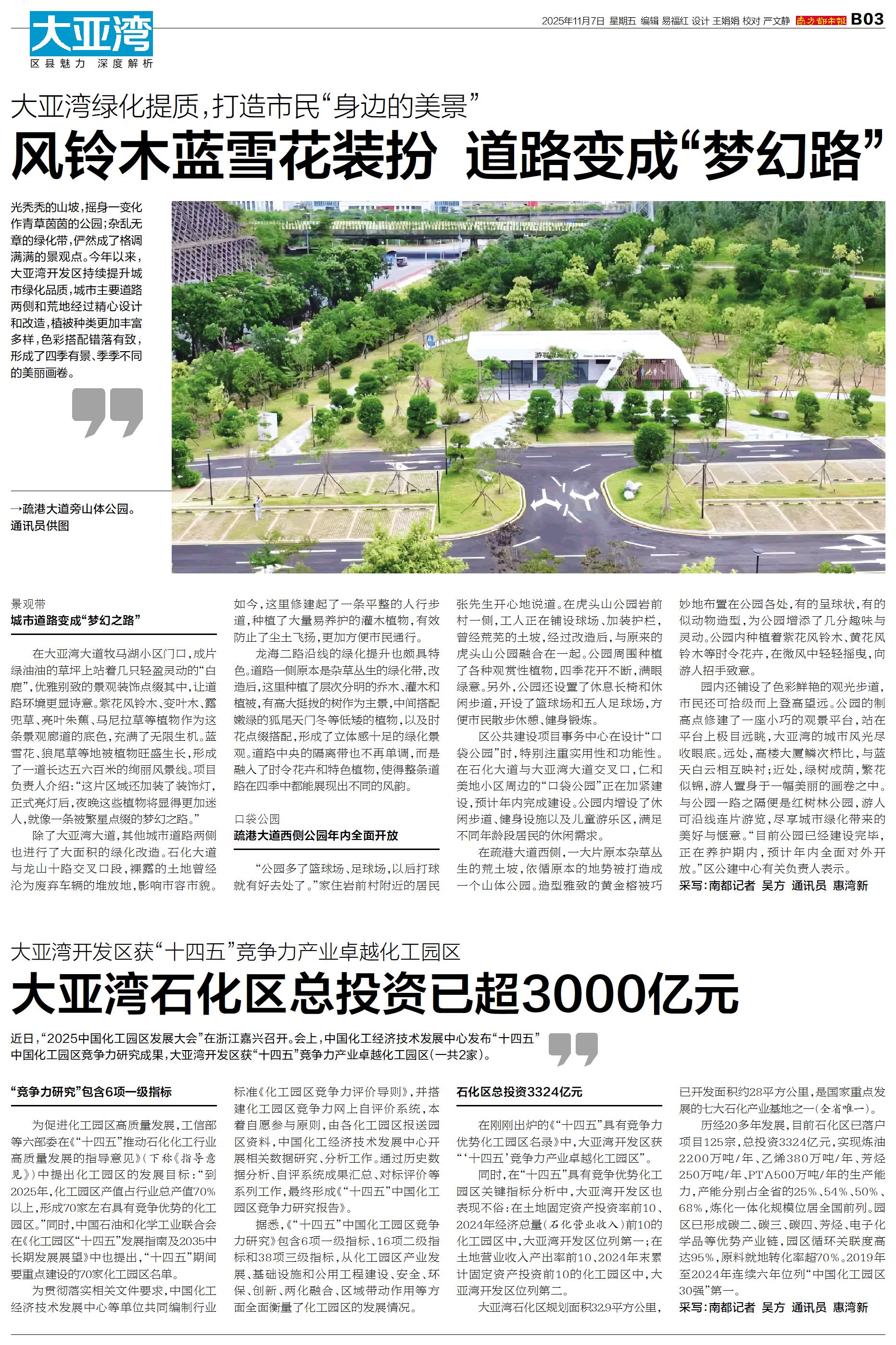 光秃秃的山坡,摇身一变化作青草茵茵的公园;杂乱无章的绿化带,俨然成了格调满满的景观点。今年以来,大亚湾开发区持续提升城市绿化品质,城市主要道路两侧和荒地经过精心设计和改造,植被种类更加丰富多样,色