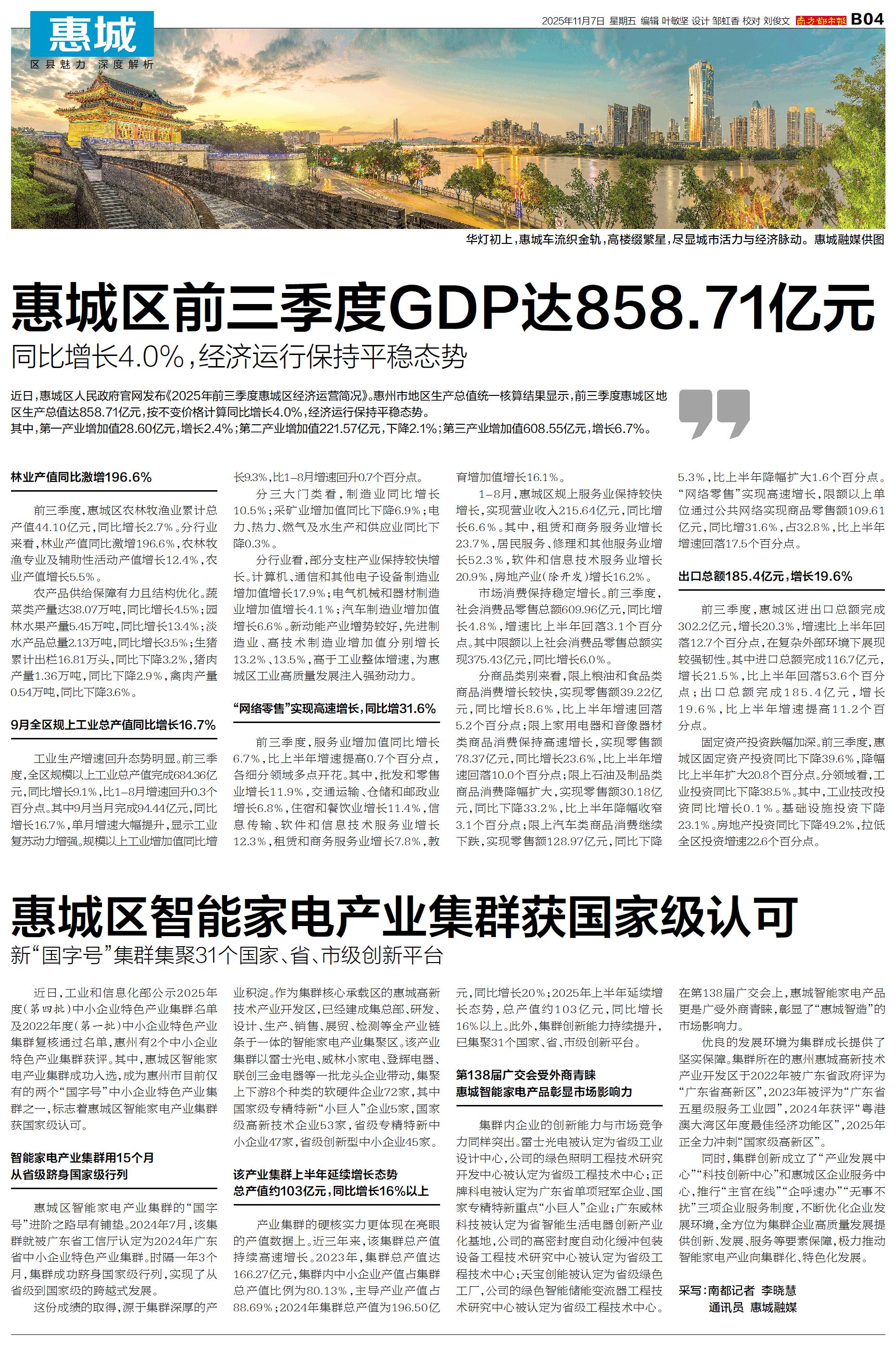 惠城区前三季度GDP达858.71亿元
