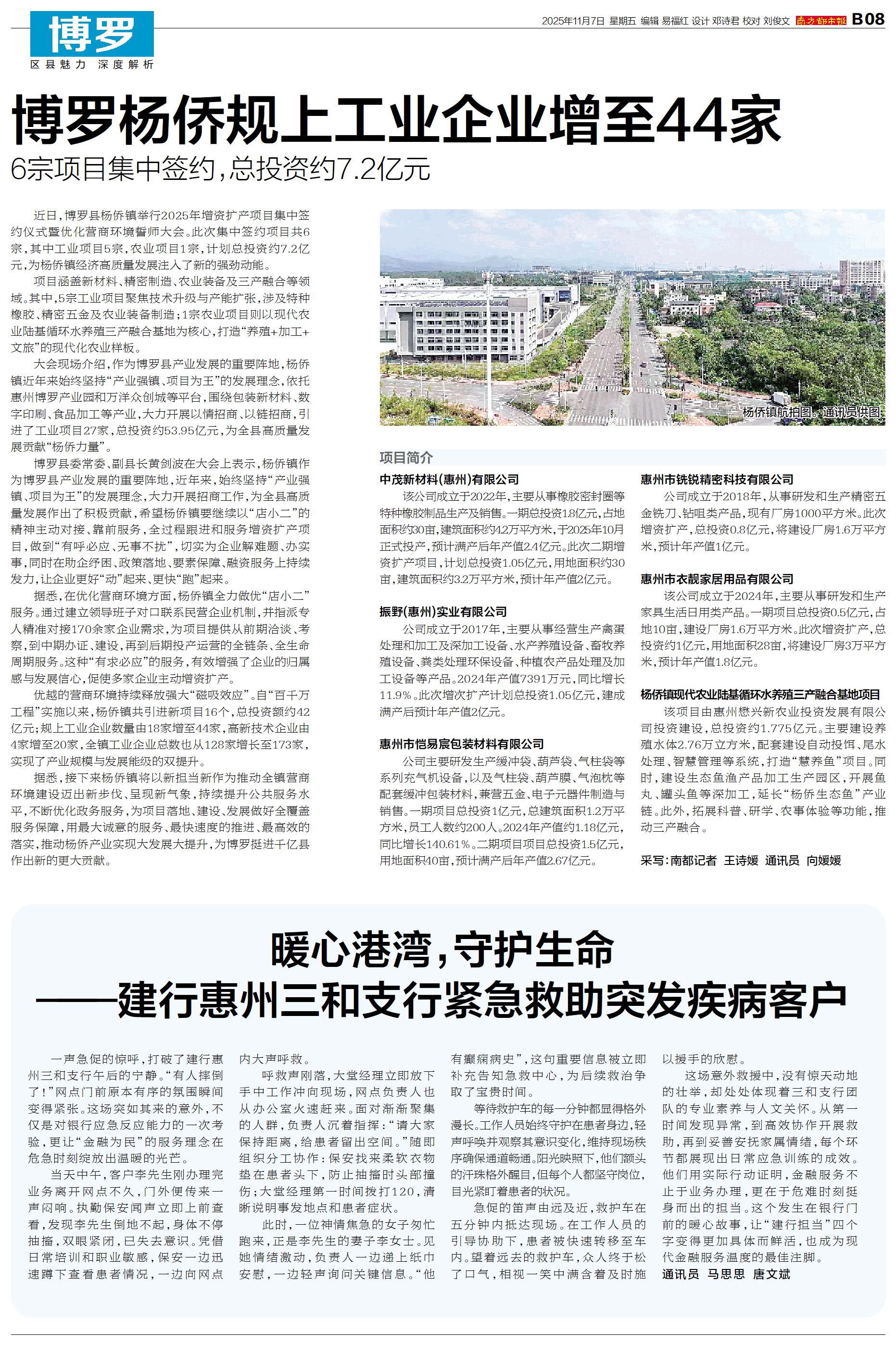 近日,博罗县杨侨镇举行2025年增资扩产项目集中签约仪式暨优化营商环境誓师大会。此次集中签约项目共6宗,其中工业项目5宗,农业项目1宗,计划总投资约7.2亿元,为杨侨镇经济高质量发展注入了新的强劲