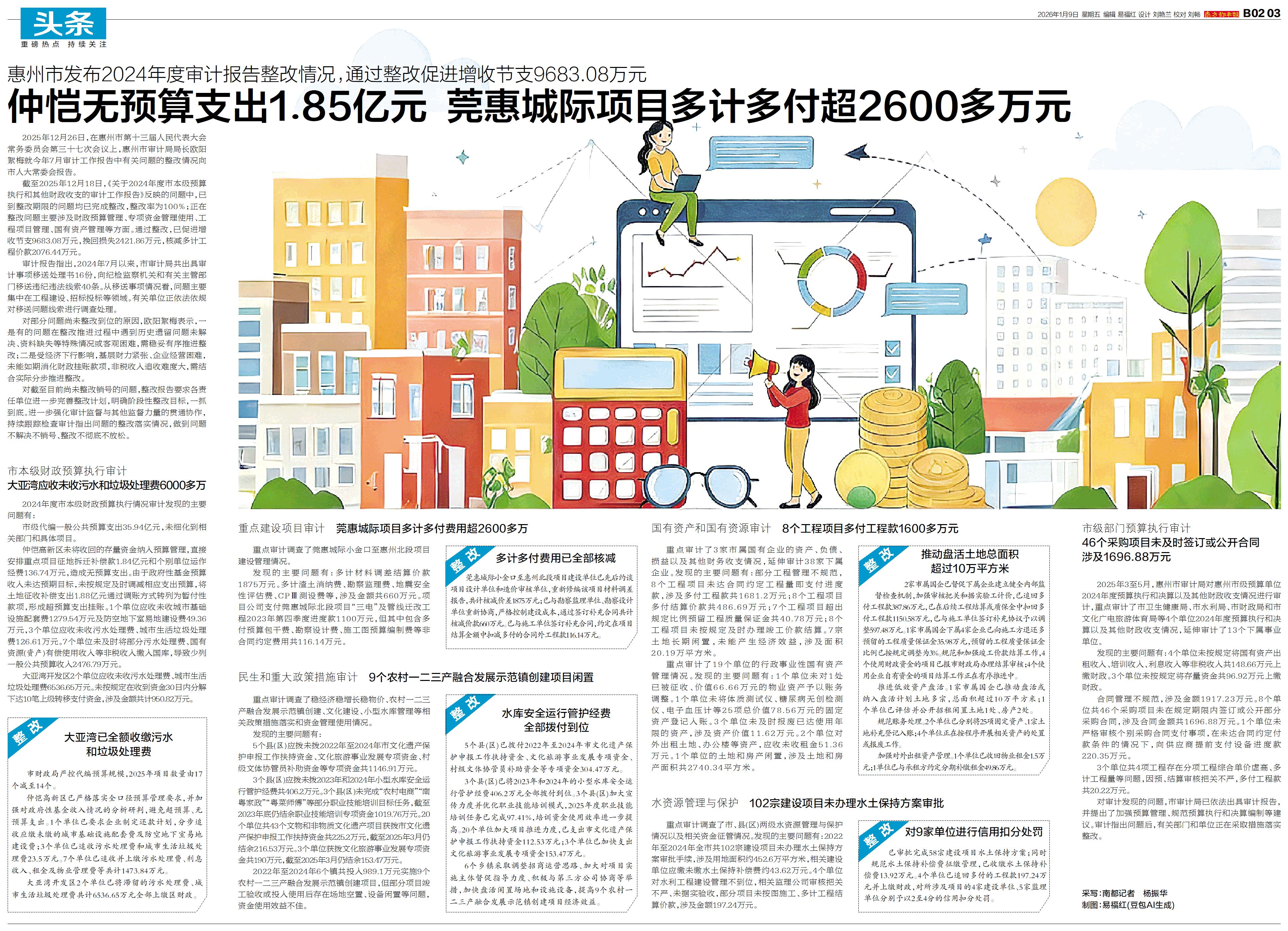 2025年12月26日,在惠州市第十三届人民代表大会常务委员会第三十七次会议上,惠州市审计局局长欧阳絮梅就今年7月审计工作报告中有关问题的整改情况向市人大常委会报告。 截至2025年12月18日