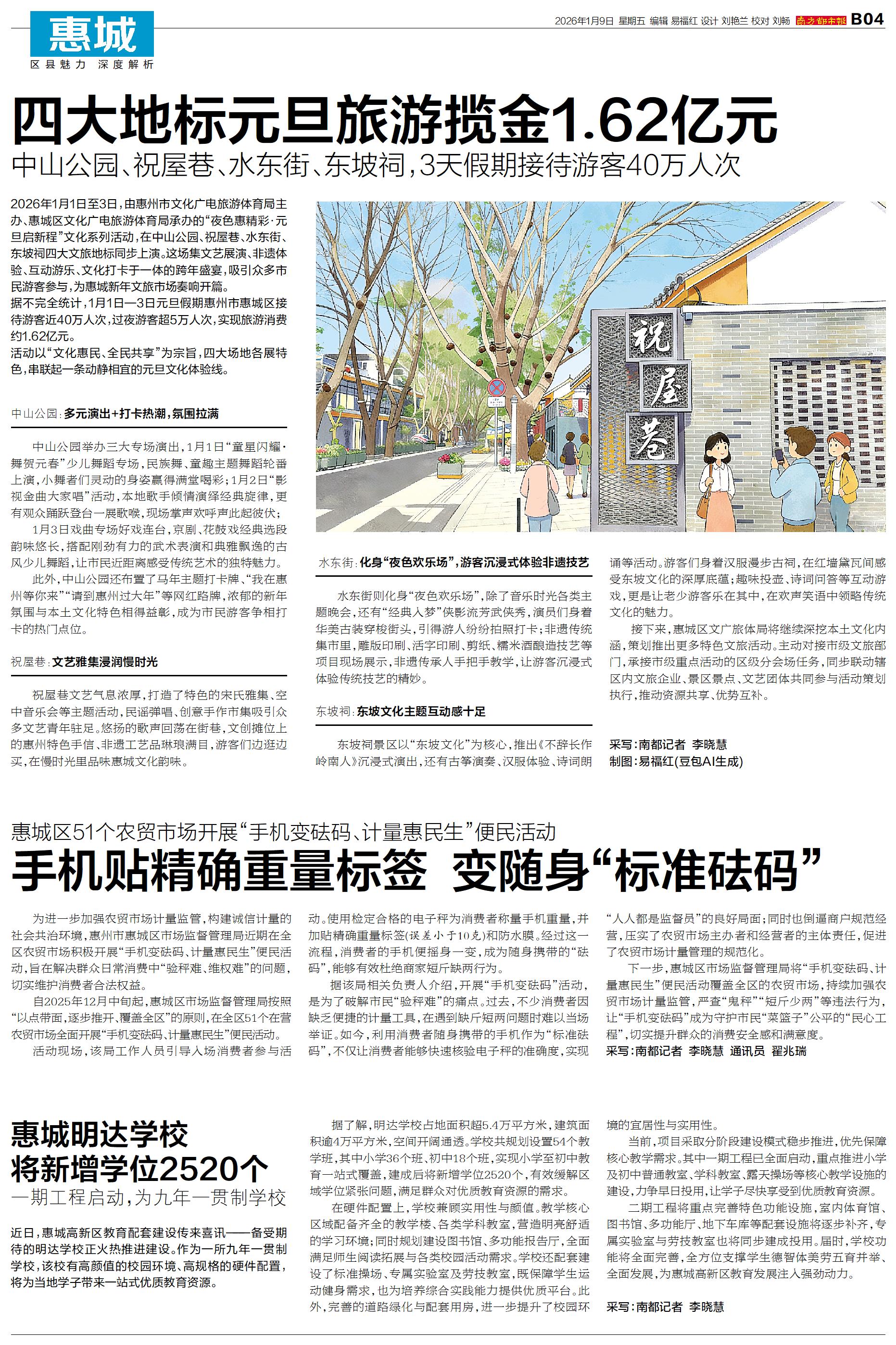 2026年1月1日至3日,由惠州市文化广电旅游体育局主办、惠城区文化广电旅游体育局承办的“夜色惠精彩·元旦启新程”文化系列活动,在中山公园、祝屋巷、水东街、东坡祠四大文旅地标同步上演。这场集文艺展