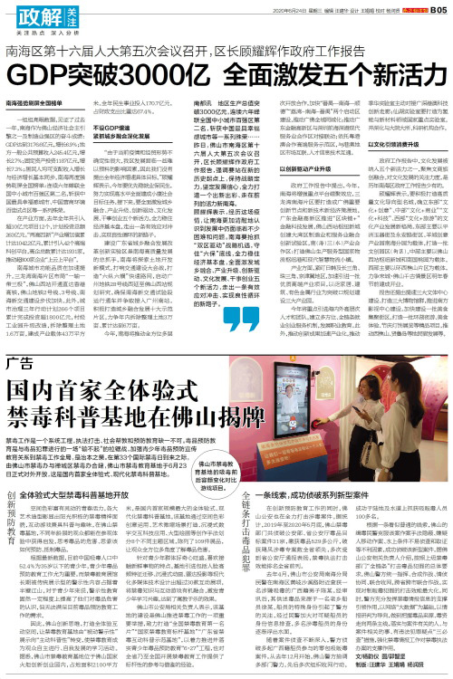 南都讯 地区生产总值突破3000亿元,连续六年蝉联全国中小城市百强区第二名,斩获中国最具幸福感城市等一系列殊荣……昨日,佛山市南海区第十六届人大第五次会议召开,区长顾耀辉作政府工作报告,强调要站在新的