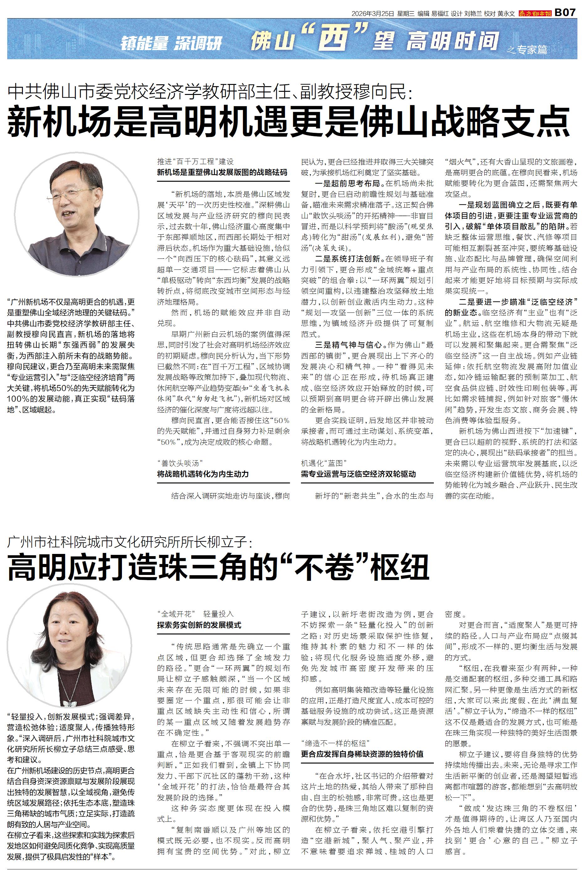 专家篇 “广州新机场不仅是高明更合的机遇,更是重塑佛山全域经济地理的关键砝码。”中共佛山市委党校经济学教研部主任、副教授穆向民直言,新机场的落地将扭转佛山长期“东强西弱”的发展失衡,为西部注入前