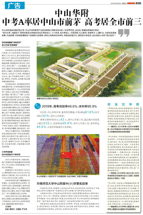中山华附是由华南师范大学、中山市华附教育产业投资有限公司联合创办的一所非营利性、全日制、寄宿制高端民办学校。“世代办学、为国育才”是学校董事长陈振初先生办学的初心。十六年来,他只有投入,不取回报;礼让