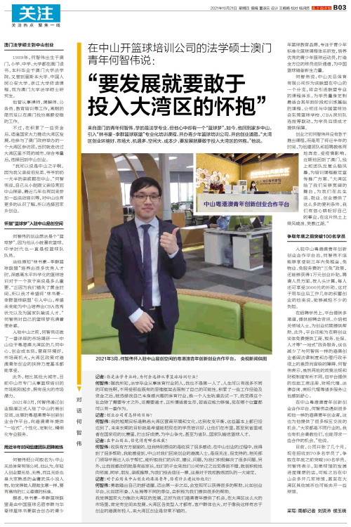 来自澳门的青年何智伟,学的是法学专业,但他心中却有一个“篮球梦”。如今,他回到家乡中山,引入“林书豪-李群篮球联盟”专业化培训课程,开办青少年篮球培训公司,开启创业道路。“大湾区创业环境好、市场大