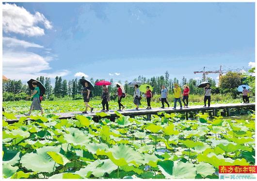 游客漫步斗门十里莲江景区。