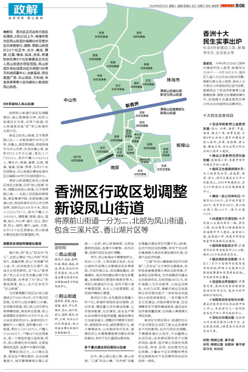 南都讯 香洲区正式宣布行政区划调整。6月22日上午,珠海市香洲区凤山街道办挂牌仪式在香洲区云峰路举行。据悉,原前山街道办24个社区中,长沙、南溪、春晖、红荔、梅溪、福溪、沥溪、界涌和东坑等9个社区居