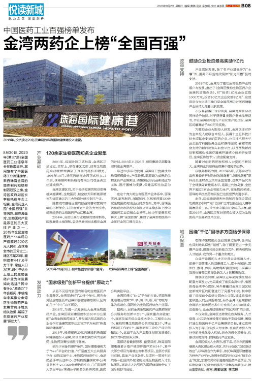 8月30日,2020年(第37届)全国医药工业信息年会在珠海举行。其间发布了中国医药工业百强榜单,来自珠海金湾的丽珠制药和联邦制药双双上榜。金湾区政府副区长李桃艳在年会上坦言,金湾药企入围“全国百强”