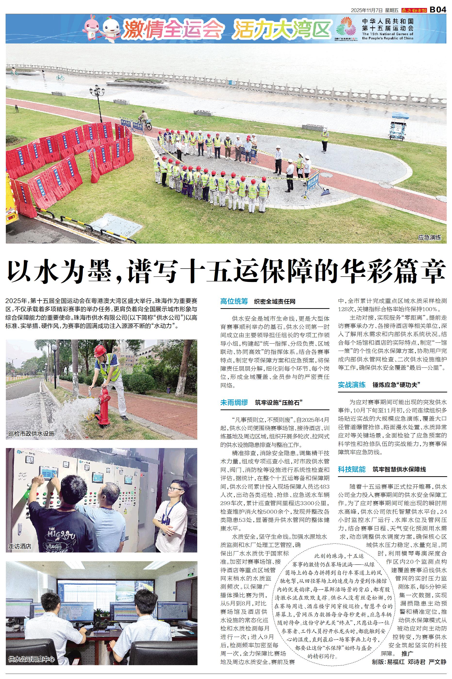 2025年,第十五届全国运动会在粤港澳大湾区盛大举行。珠海作为重要赛区,不仅承载着多项精彩赛事的举办任务,更肩负着向全国展示城市形象与综合保障能力的重要使命。珠海市供水有限公司(以下简称“供水公司