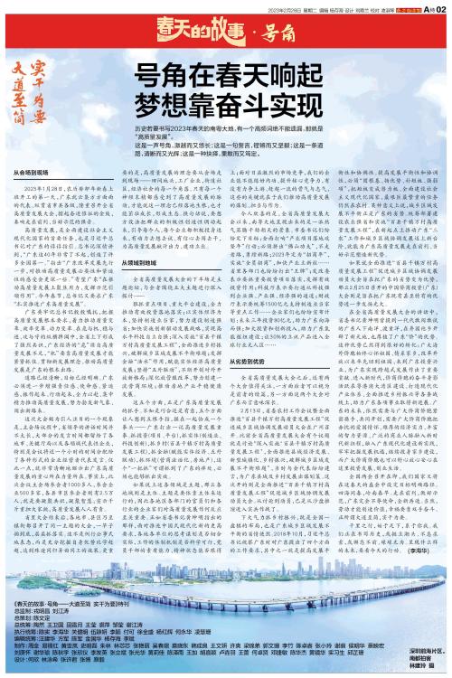 历史若要书写2023年春天的南粤大地,有一个高频词绝不能遗漏,那就是“高质量发展”。 这是一声号角,激越而又悠长;这是一句誓言,铿锵而又坚毅;这是一条道路,清晰而又光辉;这是一种抉择,果敢而又笃