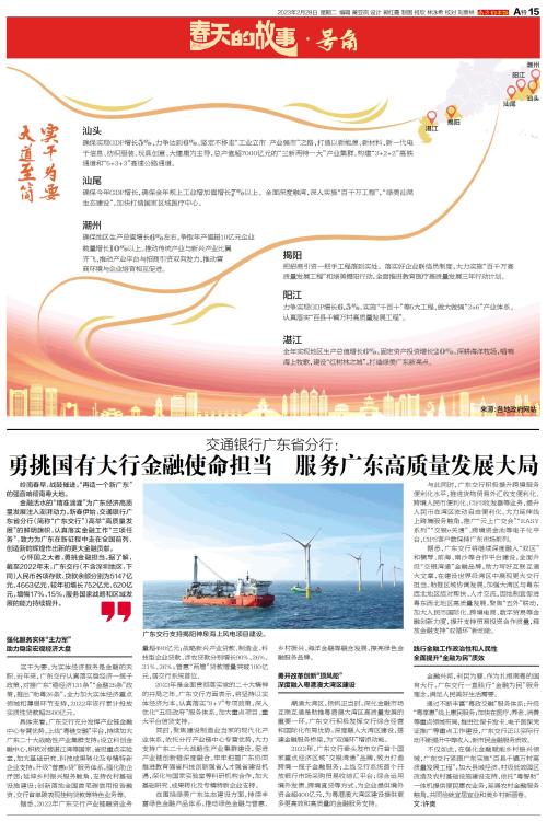 岭南春早,战鼓催进。“再造一个新广东”的强音响彻南粤大地。 金融活水的“精准滴灌”为广东经济高质量发展注入澎湃动力。新春伊始,交通银行广东省分行(简称“广东交行”)高举“高质量发展”的鲜明旗帜,