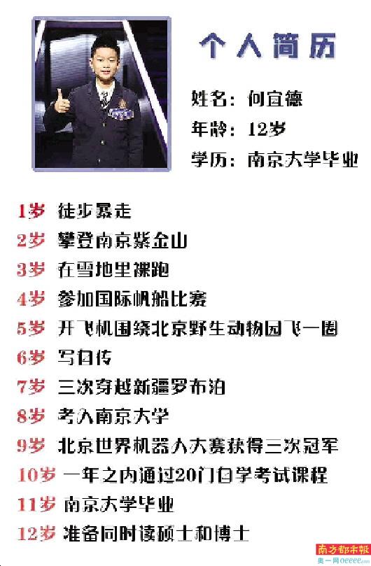 最新简历显示,现年12岁的何宜德11岁时就已从南京大学专科毕业。