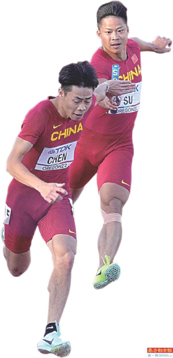在去年尤金世锦赛上,陈冠锋是中国男子4x100米接力队第四棒,第三棒是苏炳添。 新华社发