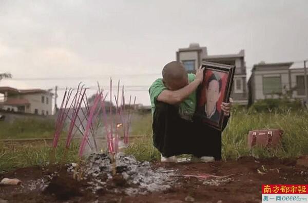 2024年11月2日,被害人姐姐李海玉手捧着父亲的遗像,去湛江鹅感村祭拜弟弟。 受访者供图