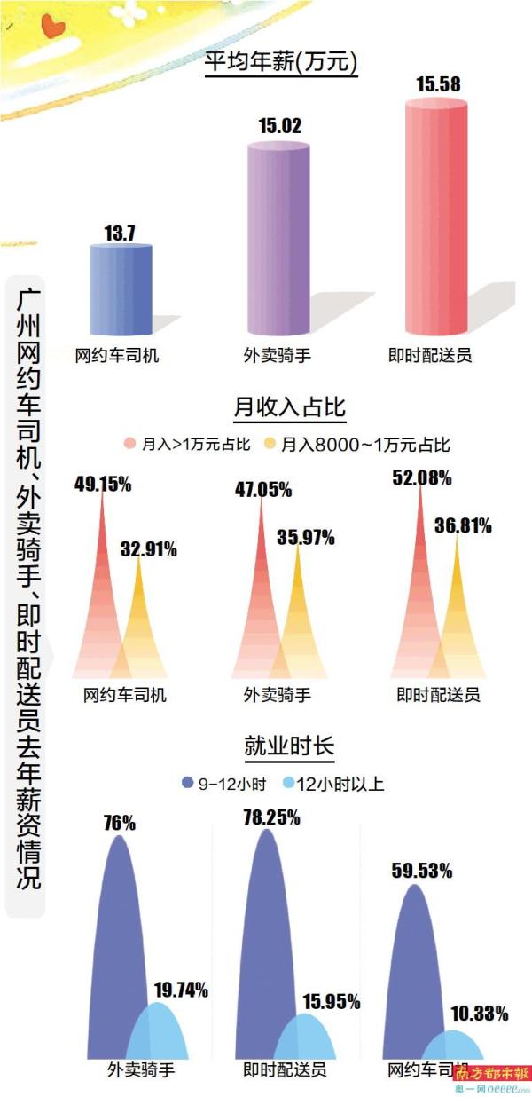 就业时间灵活是新业态行业的一大特点。外卖骑手、即时配送员的高收入,有很大一部分是靠高工作时长积累的。据广州蓝宝书统计,76%的外卖骑手、78.25%的即时配送员工作时长为9-12小时,而网约车司机工作时长在9-12小时的占比为59.53%。19.74%的外卖骑手、15.95%的即时配送员工作12小时以上,网约车司机工作时长在12小时以上的占比为10.33%,均相对更短。
