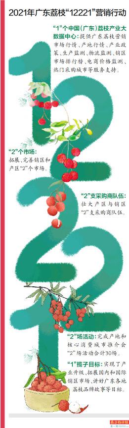 荔枝在2018年也经历了“果贱伤农”。2019年4月,省农业农村厅下发的《2019年全省荔枝营销工作方案》要求,在总结徐闻菠萝“12221”行动计划基础上,丰富完善广东荔枝“12221”:建设一个荔枝全产业链数据平台,组建采购商和经纪人两支队伍,建设产地和销区两个市场平台,策划采购商联盟走进荔枝产区及荔枝走进销区市场两场活动,实现打造品牌、扩大销量、提高价格、市场引导推广良种、果农增收等一揽子目标。