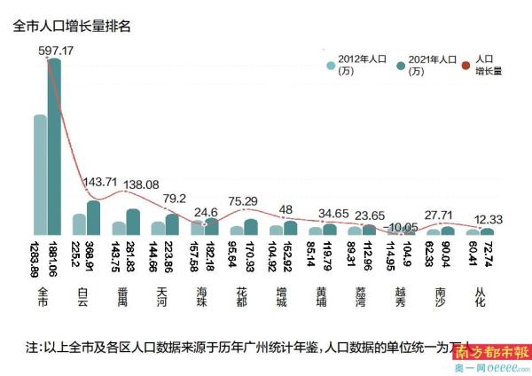 广州年鉴的历年人口统计数据显示,以番禺的东涌、大岗、榄核三镇划入南沙的2012年算起,2012年至2021年(2022年数据尚未公布)这9年,南沙新增的常住人口数量不仅低于中心城区的白云、天河、黄埔和新兴人口流入地番禺,也远远低于同属外围区域的花都和增城。