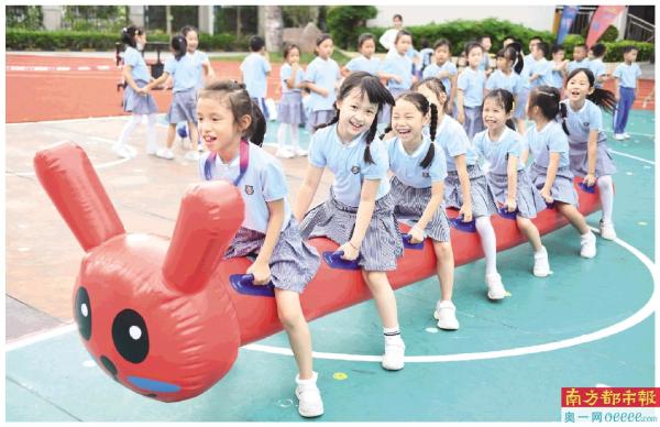 缤纷体育节上,孩子们愉快地体验趣味运动项目。