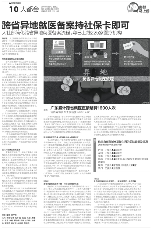 目前广东全省异地就医费用已实现“一账式”付款、“一门式”经办、“一网式”监管,较好解决了参保人省内异地就医“垫支”、“跑腿”难题。