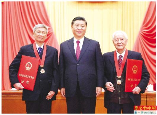 1月10日,2019年度国家科学技术奖励大会在北京人民大会堂隆重举行。中共中央总书记、国家主席、中央军委主席习近平向获得2019年度国家最高科学技术奖的原中国船舶重工集团公司第七一九研究所黄旭华院士(右)和中国科学院大气物理研究所曾庆存院士(左)颁奖。 新华社发