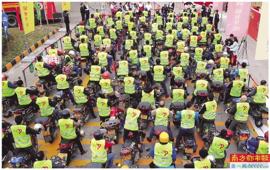 昨日,春运首日,佛山龙山加油站,上千辆返乡摩骑在工作人员的指引下有序排队,等待免费加油,准备踏上回家的路。 南都记者 何玉帅 摄