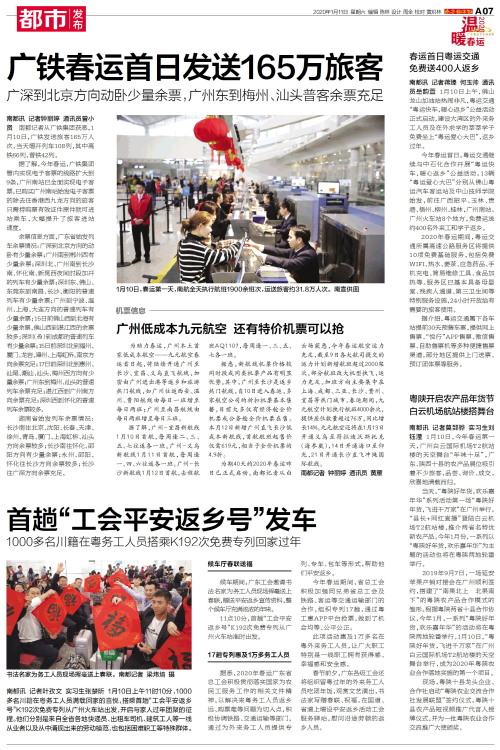 为期40天的2020年春运昨日已正式启动。南都记者从白云场获悉,今年春运航空运力充足,截至9日各大航司提交的运力计划新增航班超过2000架次,部分航班改大机型执飞,运力充足。加班方向主要集中在上海、成都、三亚、长沙、贵州、宜昌等热门城市。春运期间,九元航空计划执行航班4000余次,提供座位数量超过76万,同比增长14%。九元航空还将在1月13日开通义乌至符拉迪沃斯托克(海参崴),14日开通海口至仰光,21日开通长沙直飞冲绳国际航线。