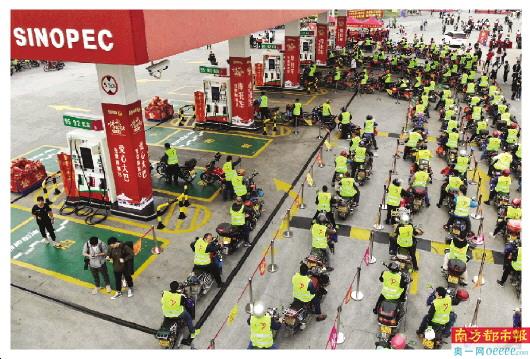 佛山龙山加油站,上千辆返乡摩骑等候免费加油。