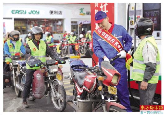 志愿者为摩托大军加油。