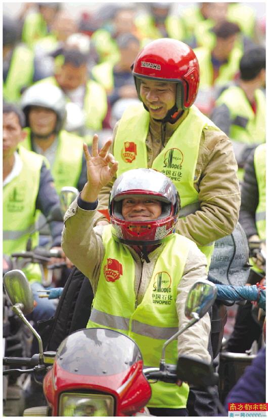 1月10日,春运首日,佛山龙山加油站,上千辆“返乡摩骑”在工作人员的指引下,免费加油、寄行李,写春联,领福袋,踏上回家的路。