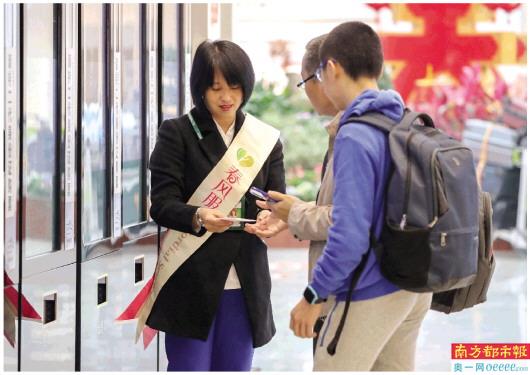 广州白云机场往返港珠澳大桥口岸专线大巴正式开通。乘车点设在T2航站楼,每天往返3班,全程预计3小时45分钟,票价105元。此外,乘客下机后,还可以选择地铁转高铁方式去往港珠澳大桥口岸。昨天,白云机场T2航站楼客运站有志愿者协助乘客购买车票。 南都记者 钟丽婷 邹卫 实习生 樊雅馨 摄影报道