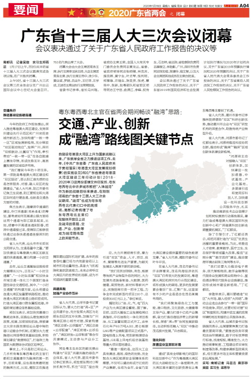 自建设粤港澳大湾区上升为国家战略以来,广东就举全省之力推进这项工作。去年,《中共广东省委 广东省人民政府关于贯彻落实〈粤港澳大湾区发展规划纲要〉的实施意见》和《广东省推进粤港澳大湾区建设三年行动计划(