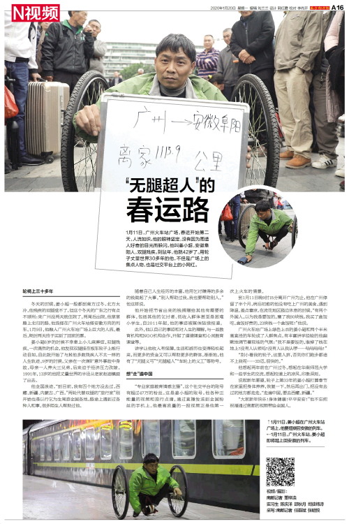 1月11日,广州火车站广场,春运开始第二天,人流如织。他的眼神坚定,没有因为周遭人好奇的目光而躲闪。他叫姜小超,安徽阜阳人,双腿残疾。到鼠年,他就42岁了。用轮子丈量世界30多年的他,不但是广场上的焦
