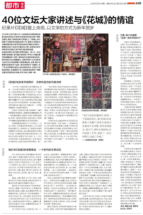 2019年12月30至31日,中央电视台科教频道《探索.发现》栏目以文学名刊《花城》杂志创刊四十周年为契机,播出了电视纪录片《花城》(上、下两集)。该片回顾了《花城》流光溢彩的四十年,追溯了《花城》与